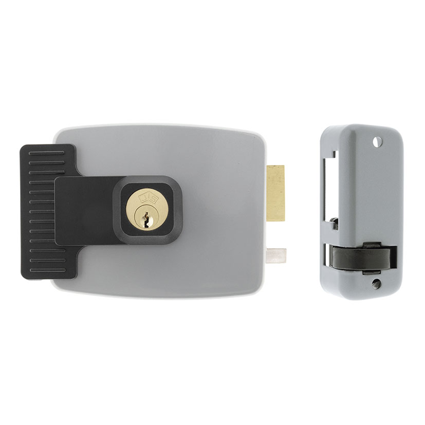 Interior cilindro. Exterior cilindro. Aguja variable 50 a 80 mm. 12V AC. 2A. Acabado gris. Incluye 3 llaves serreta.