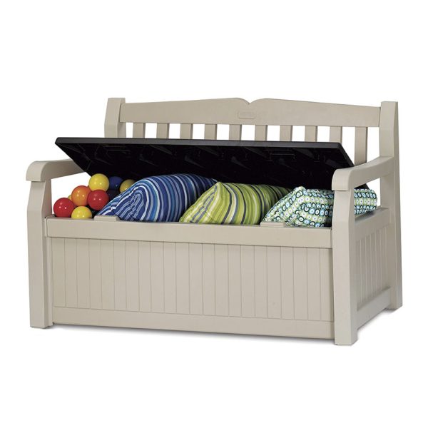 Fabricado resina imitación madera. Almacenamiento inferior 265 litros. Suelo incluido. Refuerzos metálicos en zona asiento.
